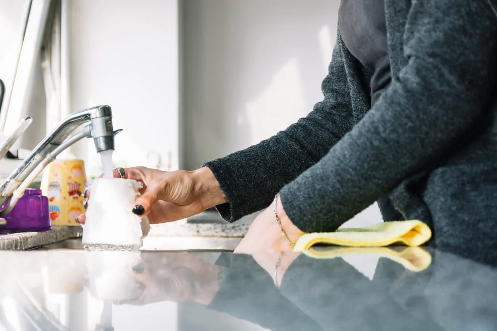 Do większości zabrudzeń w zupełności wystarczy ciepła woda z kilkoma kroplami płynu do mycia naczyń, a dodanie odrobiny octu pomoże uniknąć smug. Pamiętaj jednak, by nigdy nie stosować środków na bazie kwasów na blatach z kamienia naturalnego.